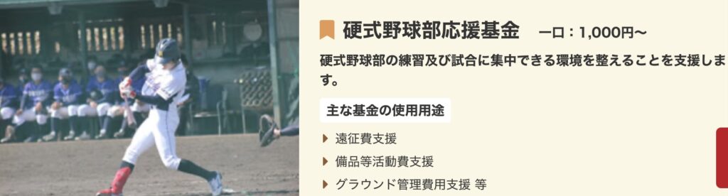 2025.10.30 新着情報 【活動資金ご寄付のお願い】 平素より弊部へのご支援•ご協力を賜り、誠にありがとうございます。現在、硬式野球部では大学が設置している特定基金での寄付のご協力をお願いしております。→ リンク先はこちら※寄付の場所のお間違えのないようご注意ください。(以下の写真のような場所への寄付をお願いいたします。) 【終了】2025年度 高校生合同練習会について 前の記事